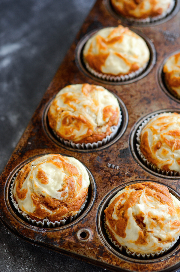 - Top each muffin with about 1 tablespoon of cream cheese mixture and use a toothpick to swirl it into the batter. This will not look smooth, but it will bake up much prettier. (You can see exactly how I did this in the video at the top of the page.)